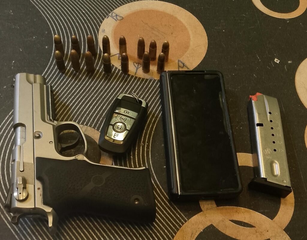 Durante la inspección del vehículo, los agentes encontraron debajo del asiento delantero derecho una pistola calibre 9mm, marca Smith & Wesson, modelo 5906TSW, color niquelado con empuñadura negra, junto a su cargador con 15 cápsulas. Al no presentar documentación que acreditara su legalidad, se le notificó su detención por violación a la Ley 631-16 sobre control y porte de armas de fuego en el país.